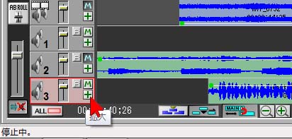 ヘッドホンをご使用でなくスピーカーから音を出している場合は、音声トラックの「M」ボタン(ミュートボタン)をクリックして、録音時に音が出ないようにしておきます。