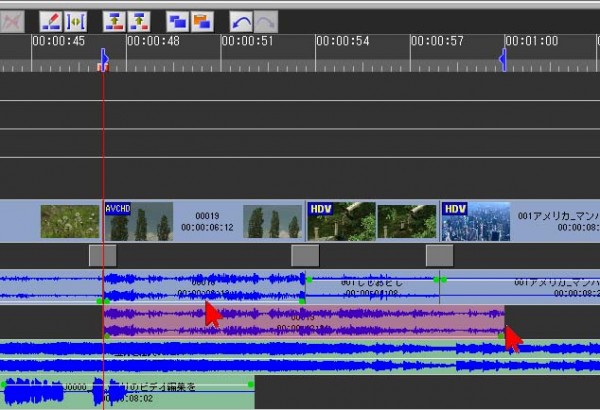 「ペースト」(貼り付け)ボタンをクリックすると、同じ時間軸の違うトラックに、動画素材の音声だけを抜き出すことができます。