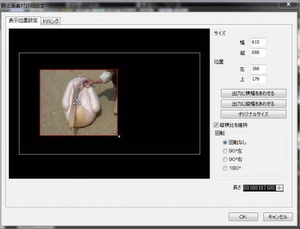 (表現例3)「縦横比を維持」をクリックしてチェックを入れてから写真の角をドラッグアンドドロップすると、縦横比を維持したまま写真を拡大・縮小できます。ビデオの大きさより小さくすれば、ピクチャインピクチャ(子画面)として写真を使うことが可能です。位置は写真の内側で十字のマウスポインタになったらドラッグアンドドロップして移動します。