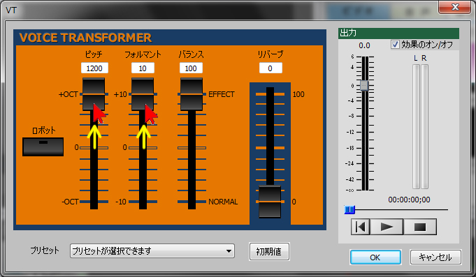 「 ピッチ 」(声の高低調節)のスライダーと「 フォルマント 」(声のキャラクター調整)のスライダーを両方上げるとアニメーションなどでおなじみの奇妙な甲高い声になります。