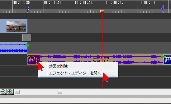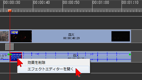 この音声に「効果パレット」の「音声効果」から「ミキサー」を放り込みます。効果を調整するには、放り込んだアイコン(マーク)の上でダブルクリック、または右クリックして「エフェクトエディターを開く」を選択・クリックします。