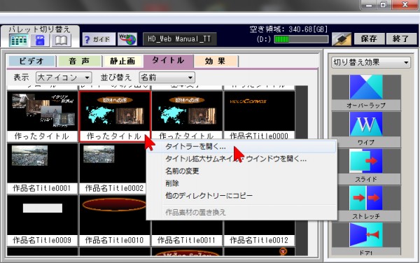 まず、背景にタイムライン映像を貼り付けたいタイトルをダブルクリック、またはタイトル上で右クリックして「タイトラーを開く」をクリック・選択してタイトルを開きます。