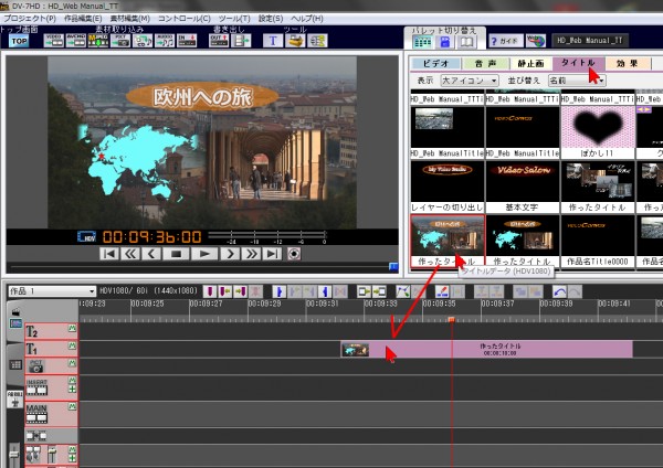 素材パレットの「タイトル」タブを開き、保存されたタイトルをタイムライン・パレットのタイトルトラックへ配置します。下に動画や静止画が無くても(作品のどこに配置しても)、タイトルに貼り付けた背景が文字や図形の下に表示されています。