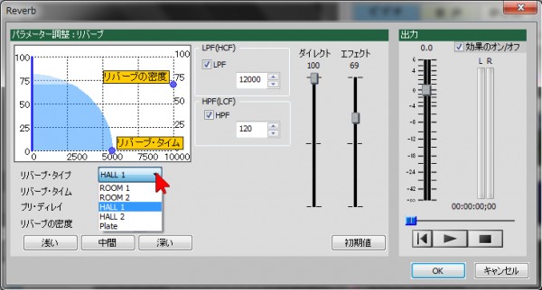 LPF(HCF)、HPF(LCF)とは、残響音の高い音や、低い音をけずる(聞こえなくする)ときに使います。LPFにチェックを入れると、高い音をカットすることができます。。HPFにチェックを入れると、低い音をカットすることができます。(欲しい音のイメージで調整しましょう)