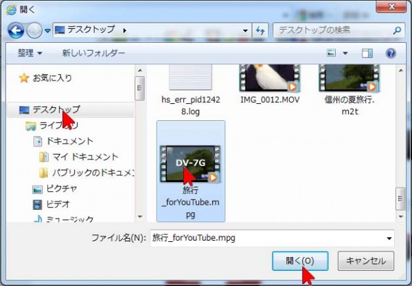 ビデオキャンバスから書き出した動画ファイルを選択します。この例では「デスクトップ」をクリックして保存した動画ファイルをクリックして選択し、「開く」をクリックします。