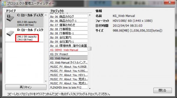 作品を別のドライブ(※)に複製するには、いくつか方法がありますが、ここではまず「プロジェクト管理」画面を使った方法です。。